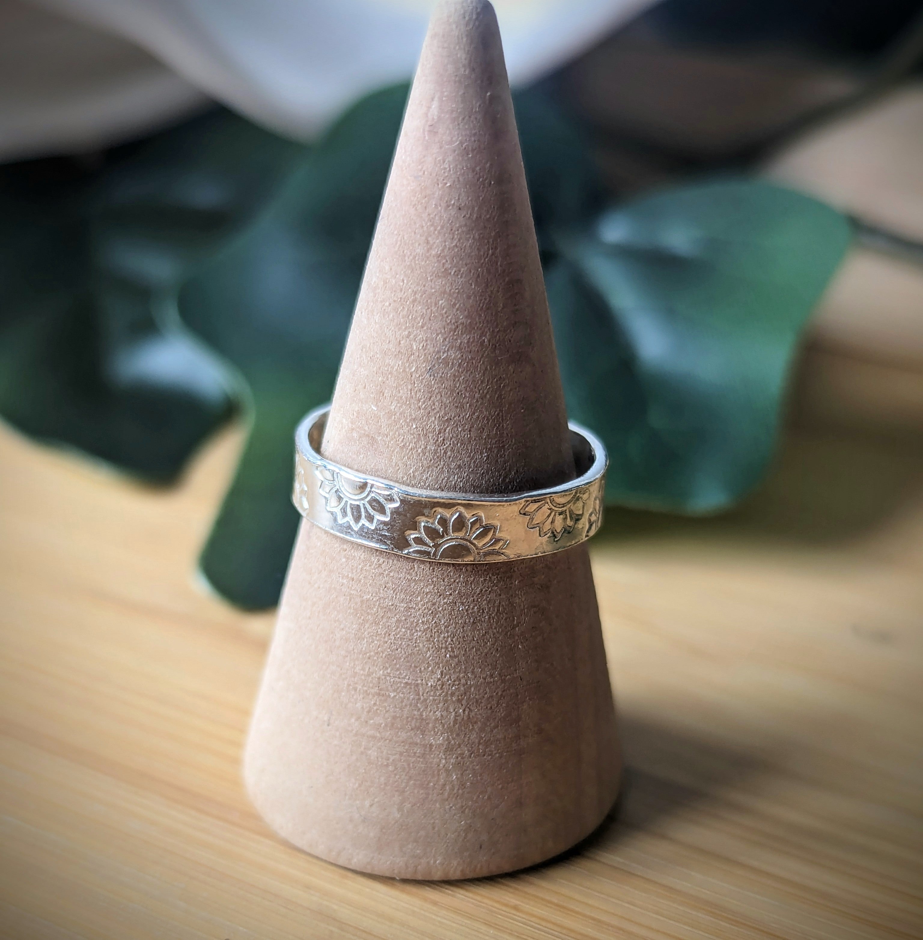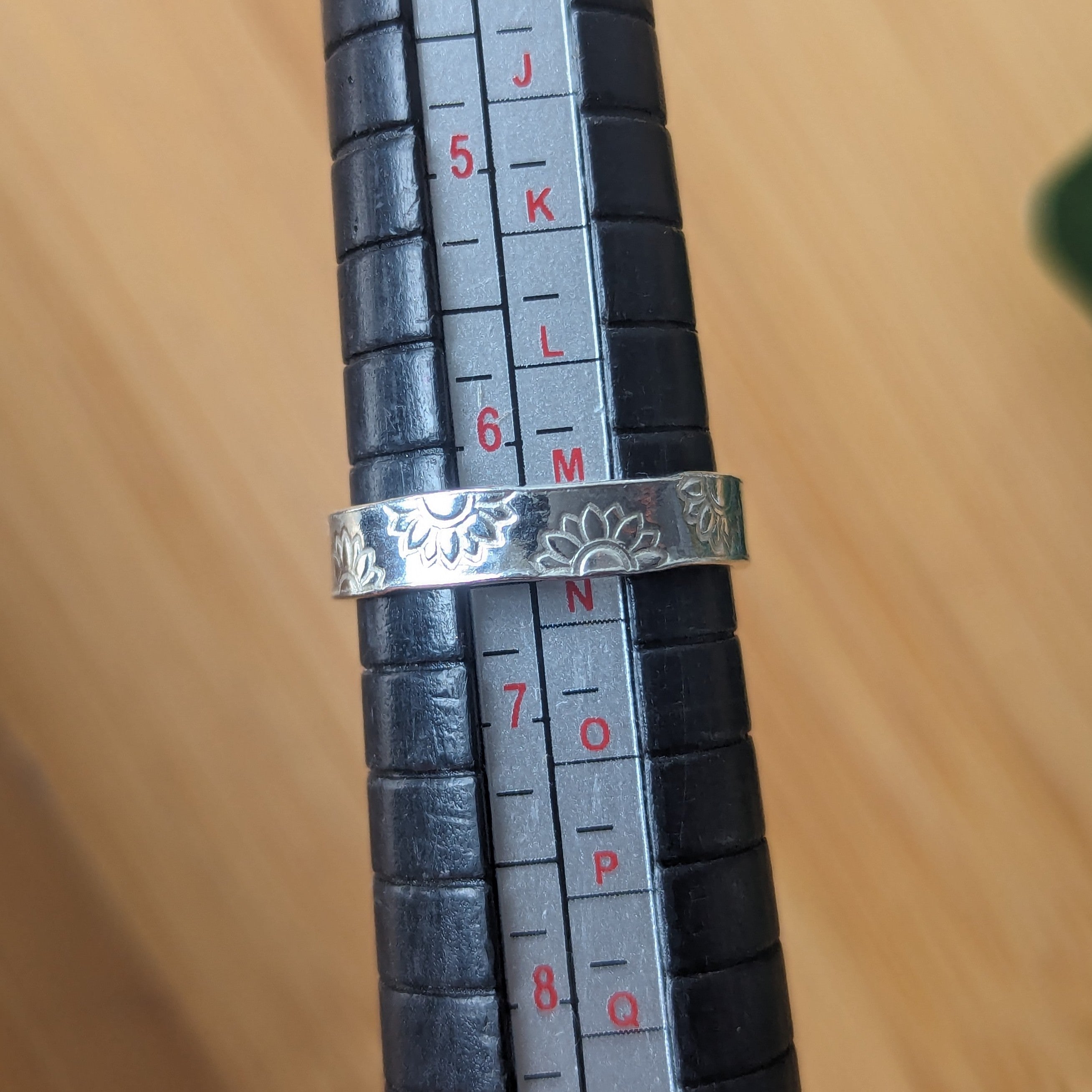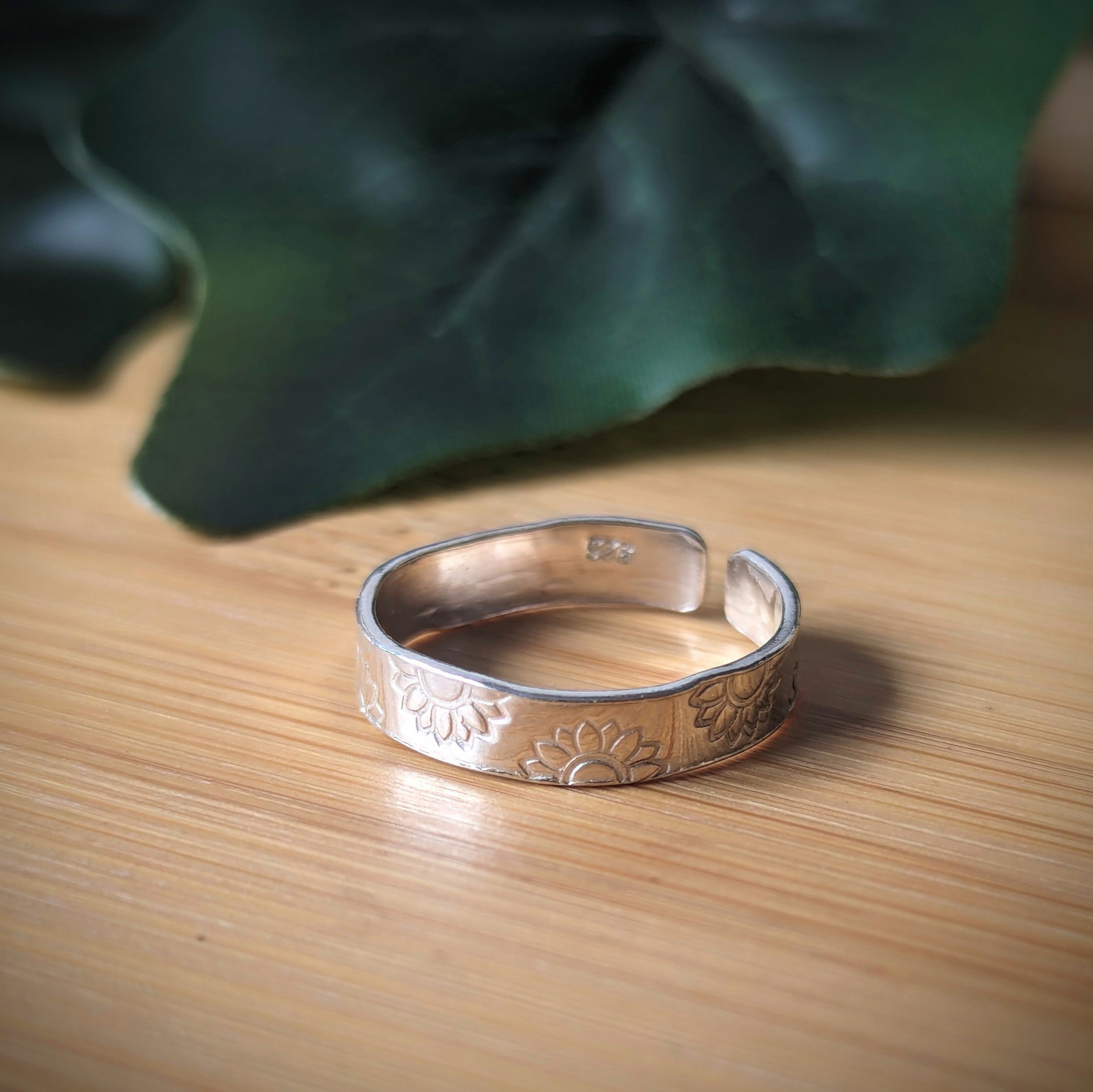 This adjustable ring has been handmade from 925 Sterling Silver and at it's smallest setting is a size M.