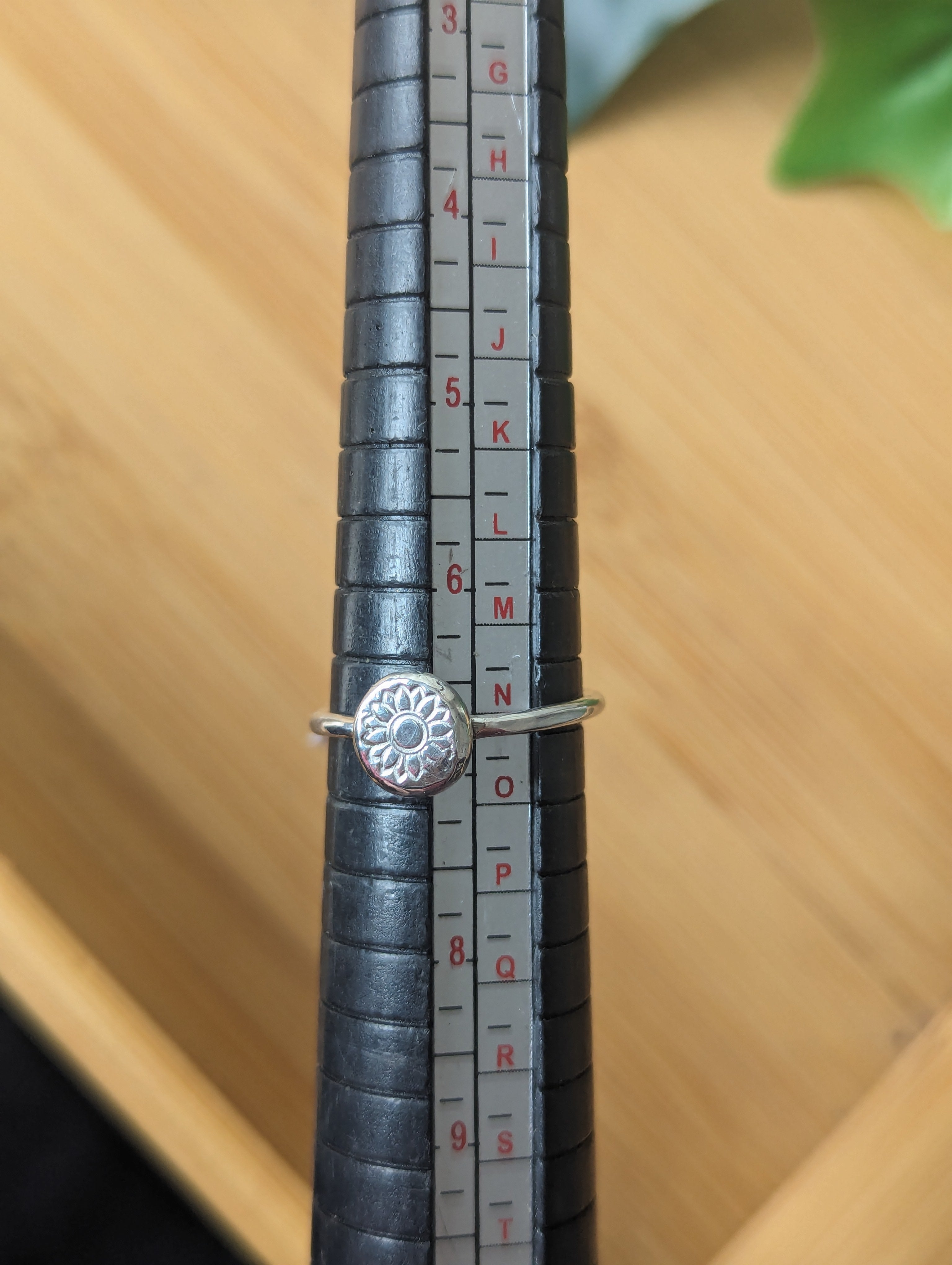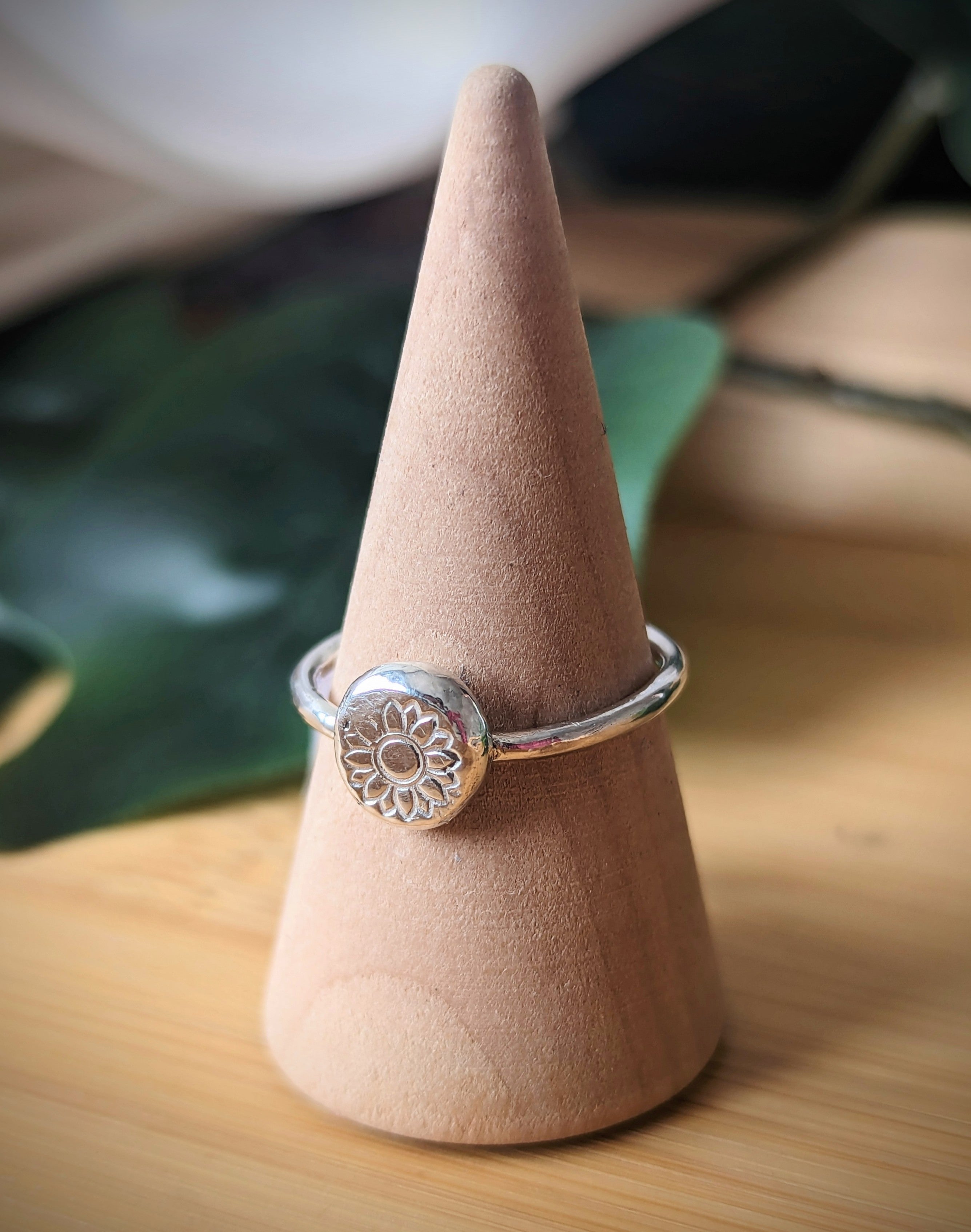This ring is made using recycled silver. Set onto a round band, hand stamped with a sunflower and is super comfortable for daily wear.